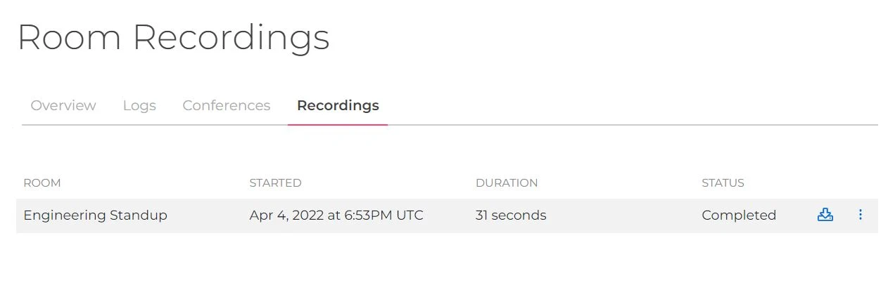In this tab, you can access recording details, download the recording, or delete it.